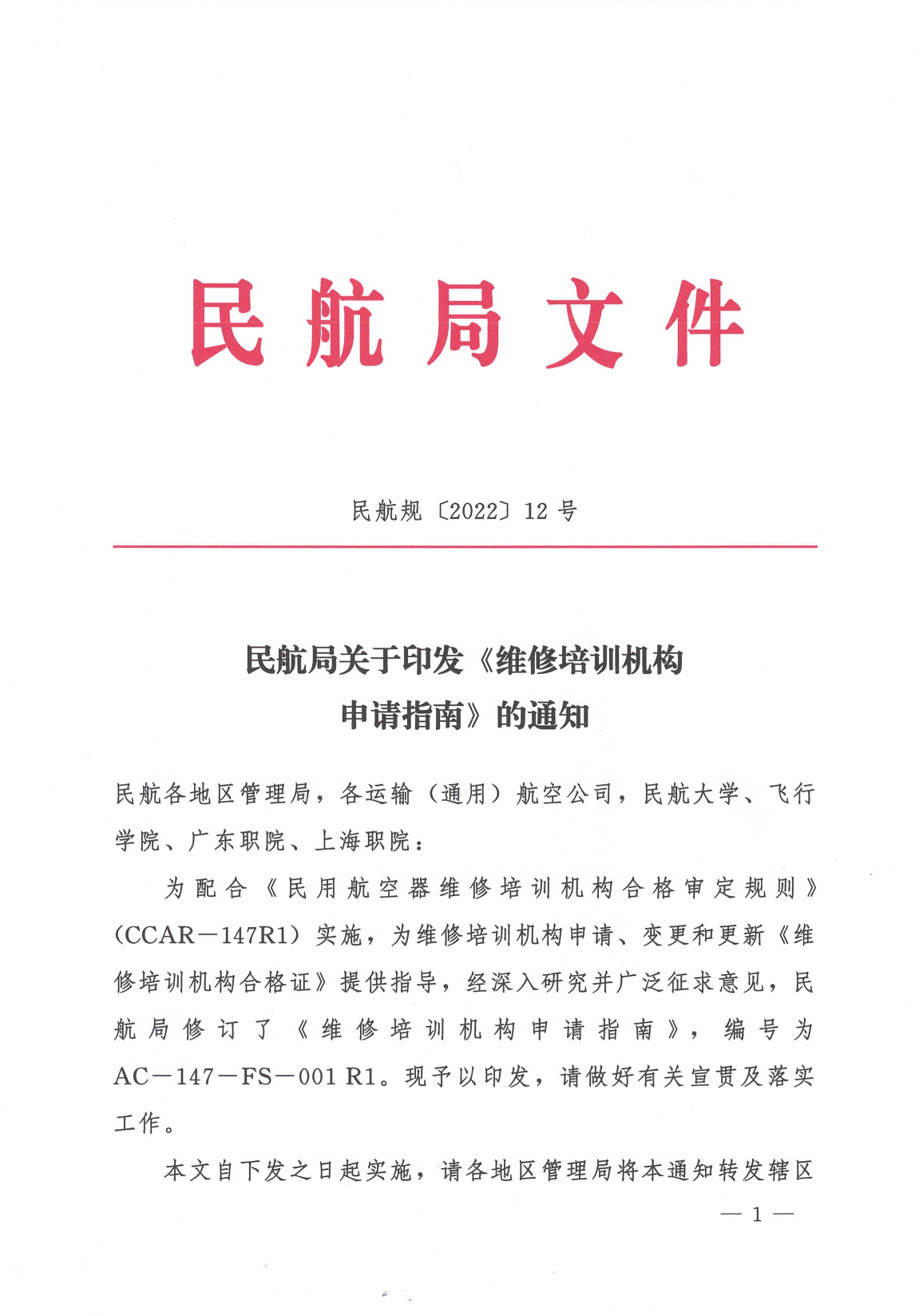 AC-147-FS-001?R1民航规〔2022〕12号-《维修培训机构申请指南》